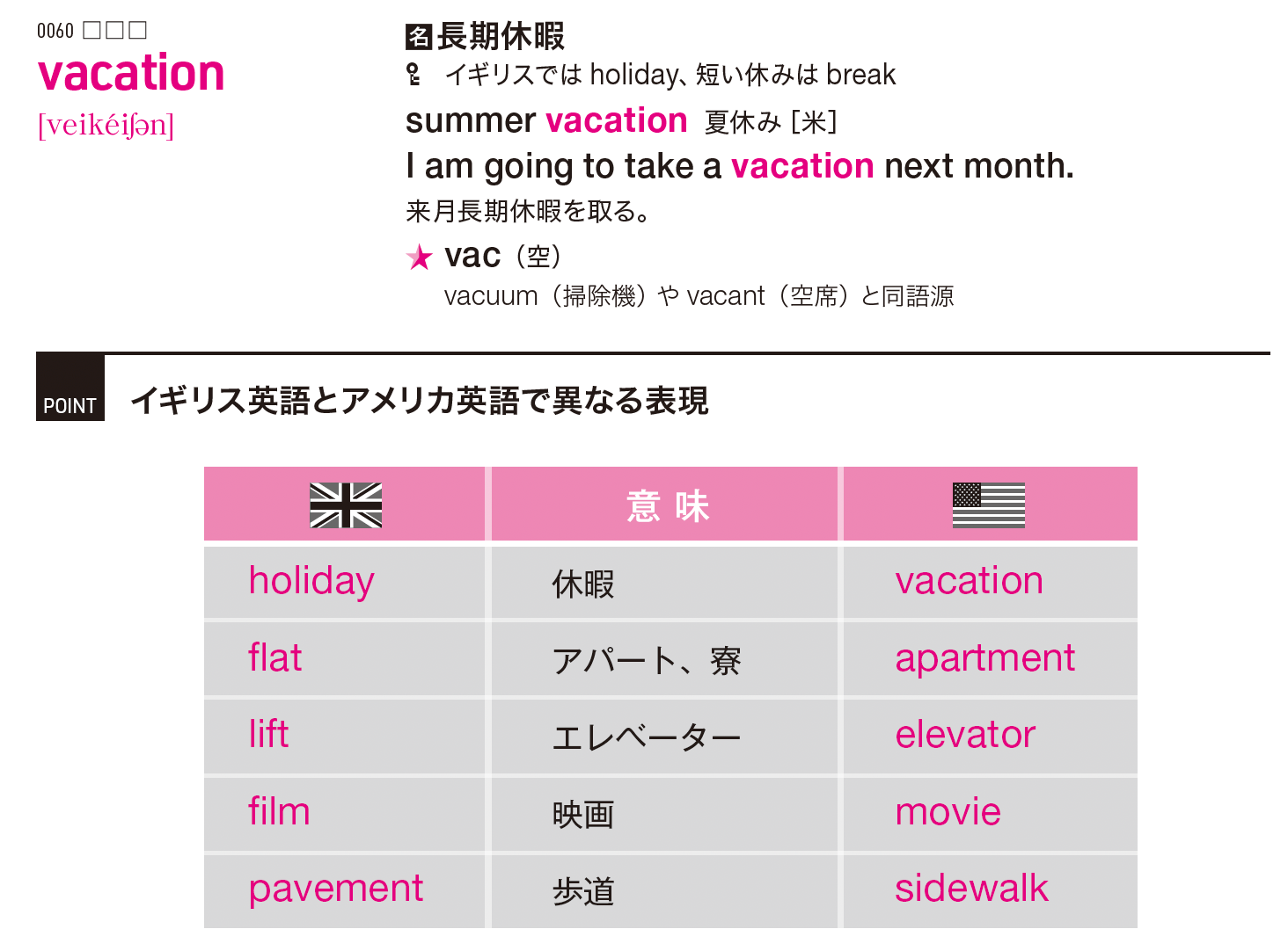 アメリカ英語のvacationのvacは「空」という語源があり、「休日」は学校や仕事がなくスケジュールが空いているイメージができます。vacances(バカンス)はフランス語由来で「長期休暇」を意味します。「真空」や「掃除機」を意味するvacuum、「空席」を意味するvacant、他にもvanish(突然完全に消える)、vanity(虚栄心)、void(虚空)など高度な英単語も同語源です。またevacuateでe(外に)+ vac(空)という語源で今いる場所から外に出て空っぽの状態にするというイメージから「避難する」となります。イギリス英語のholidayはholy(聖なる)+day(日)から成り立っていてクリスマスやイースターなどの宗教的な祝日が由来になっています。holiday of obligation はカトリック教徒が肉体労働を控えてミサに出席すべき義務的な聖日を指し、西洋で取り入れられている考えです。