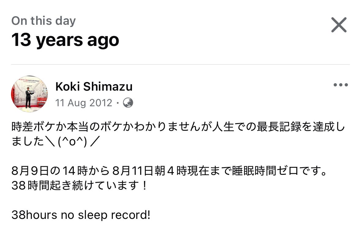 「休日」の概念は文化により異なり、日本は「休日」に関しても島国特有の独特の文化があり、「皆勤賞」という謎のアワードもあります。中国の小中学校では伝統的に昼寝の時間を設けられていて、昼寝用のベッドに変形する学習机を導入している学校もあります。また日照時間の長いスペインで生まれた昼寝の文化、シエスタ(siesta)制度を導入する企業も増えています。僕自身、20代は休むべからずの精神で身を削って徹夜を繰り返し、仕事に専念してきましたが、休まず働く戦略は一ミリもオススメしません。急がず、休まず、牛歩の歩みで着実にタスクを熟していく働き方をオススメしています。13年前の今日のSNS投稿を見ると突っ込みどころが満載です…